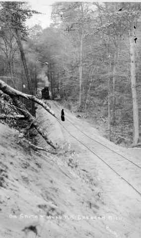 Coming through the woods - a view of the Smith & Hull narrow-guage logging railroad.