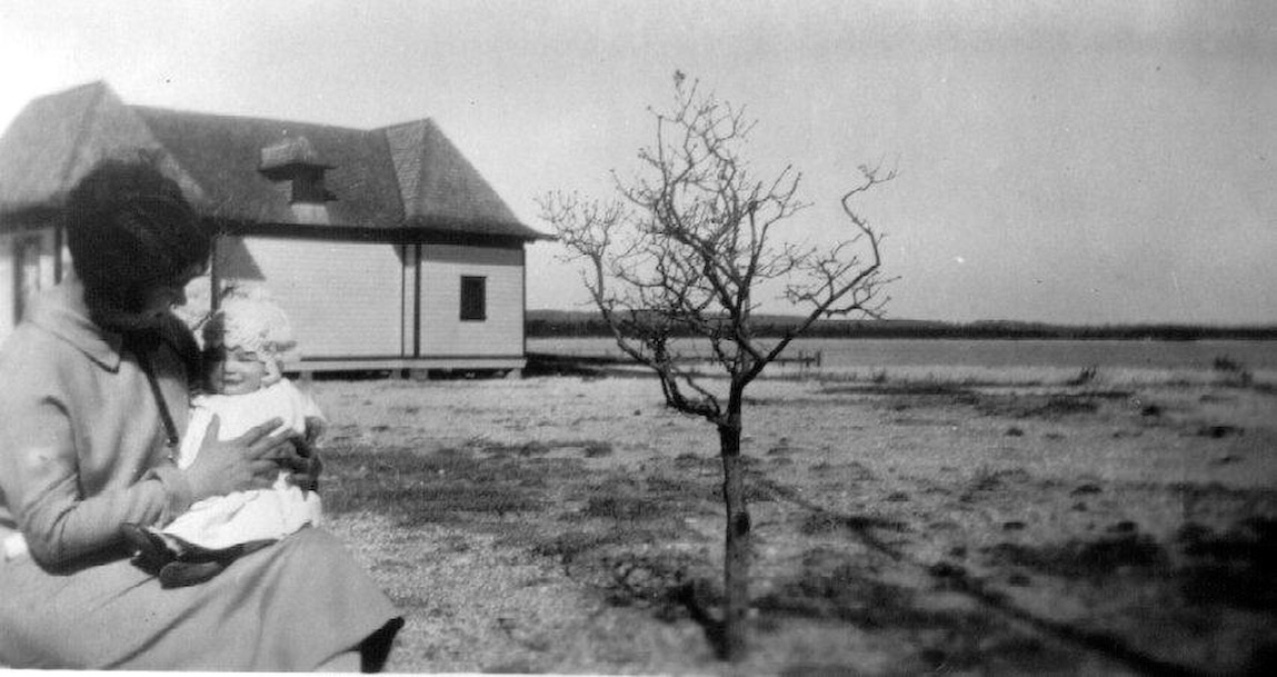 Lenore (Warner) VanderWagen with daughter Merlene in 1928 on South Manitou Island (notice boathouse in front of August Warner house).